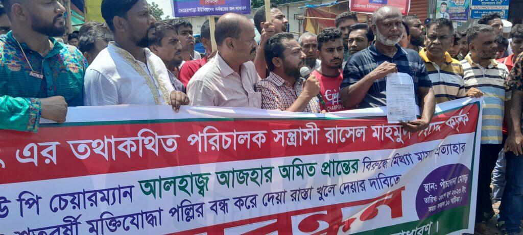 মানব বন্ধনে উপস্থিত বক্তারা বলেন, গত ১ বছর পূর্বে কামাল হোসেন নামে এক ব্যক্তি পাঁচদোনা মোড়ে স্থানীয় কয়েক জন মালিকের নিকটথেকে জায়গা ভাড়া নিয়ে আল্লাহর দান নামে একটি পাইকারী আড়ত নির্মান করেন। উক্ত আড়তের মধ্যে সরকারী প্রায় ৫৫ শতাংশ খাশ জমিও রয়েছে। আড়ত টি নির্মান করার সময় সরকারী অনুমতি না থাকা ও বিভিন্ন মালিকানা জটিলতায় মামলা মোকদ্দমার সৃষ্টি হলে,নরসিংদী সদর উপজেলা নির্বাহী কর্মকর্তার উপস্থীতিতে ভোলডোজার দিয়ে আড়তের মেইন রাস্তা বন্ধ করে দেয়া । পরে উক্ত কামাল হোসেন তার ভাগিনা পরিচয়ে শেখেরচর বাসষ্টেন্ডের হাবিবুর রহমানের ছেলে রাসেলমাহমুদ(সাউথ আাফ্রিকা রাসেল) কে আল্লাহর দান পাইকারী আড়তটির পার্টনার হিসেবে পরিচালক বানায়। কিছুদিন পর আল্লাহর দান পাইকারী আড়তের দক্ষিন পাশে ইমর্পোট এক্সর্পোট নামে আরেকটি পাইকারী আড়ত অন্য মালিক নির্মান করে। এর থেকেই দুই মালিকের পূর্ব শত্রুতার জেরধরে রাসেল গংরা সস্ত্রাসী র্কাযক্রম শুরু করে। যার ফলশ্রুতিতে আল্লাহর দান পাইকারী আড়তটির চারধিক খোলা থাকলেও পেশী শক্তির বলে রাসেলগংরা প্রায় শতবছরের পুরোনো মুক্তিযোদ্ধা পল্লি ও হিন্দু অধ্যশিত এলাকার রাস্তাটি বন্ধ করে দেয়। এতে তাৎক্ষনিক ভোগান্তির স্বীকার হচ্ছে মুক্তিযোদ্বা পল্লীর বসবাসরত লোকজন ও মসজিদে আগত মুসুল্লিসহ রাস্তা দিয়ে চলাচলরত ছাত্রছাত্রীরা এবং হিন্দু অধ্যসিত এলাকার তিনটি গ্রামের জনসাধারন। বন্ধ করে দেয়া রাস্তাটি খুলে দেয়ার জন্য এলাকাবাসী ইউপি চেয়ারম্যান আলহাজ আজহার অমিত প্রান্তকে বিষয়টি অবহিত করে তার হস্থক্ষেপ কামনা করেন। চেয়ারম্যান গ্রাম পুলিশ নিয়ে গত ১৯ জুন ঘটনাস্থলে এসে বন্ধ রাস্তাটি খুলে দেয়ার নির্দেশ দিলে বর্তমানে সৌদি আরবে অবস্থানরত রাসেল মাহমুদের নির্দেশে তার ভাই হিমেল,পাভেল,নোভেল সহ তাদের সহযোগীরা চেয়ারম্যান ও তার লোক জনের উপর অর্তকিত হামলা চালায়। পরে স্থানীয় এলাকাবাসী প্রতিরোধ করতে গিয়ে সন্ত্রাসী বাহিনীকে মারধর করে তাড়িয়ে দেয়। এঘটনায় উক্ত রাসেলের পিতা হাবিবুর রহমান বাদী হয়ে গত ১৯ জুন নরসিংদী বিজ্ঞ আদালতকে আসল তথ্য গোপন করে ইউপি চেয়ারম্যান কে প্রধান আসামী করে আরো ১১ জনের বিরুদ্বে কোর্টে মিথ্যা মামলা দায়ের করেন। যাহা সম্পূর্ন মিথ্যা ভিত্তিহীন ও হয়রানী মূলক বলে মানব বন্ধনে অভিযোগ করা হয়। মানববন্ধনে বক্তারা বলেন, অভিলম্বে শতবছরের পুরোনো মুক্তিযোদ্ধাপল্লির বন্ধ করে দেয়া রাস্তা সর্ম্পূন খুলে দেয়া এবং মেহেরপাড়া ইউপি চেয়ারম্যান এবং তার লোকজনের বিরুদ্ধে মিথ্যা মামলা প্রত্যাহার ও রাসেল গংদের বিরুদ্ধে আইনানুগ ব্যবস্থা গ্রহন করতে হবে। নতুবা ঢাকা সিলেট মহাসড়ক অবরোধ করে আন্দোলন করা হ