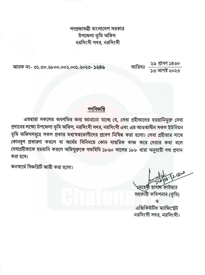 ভূমি সেবা গ্রহীতাদের দালাল ও হয়রানীমুক্তভাবে সেবা প্রদানের জন্য গণ বিজ্ঞপ্তি জারী করেছেন, নরসিংদী সদর উপজেলা সহকারী কমিশনার (ভূমি) মেহেদী হাসান কাউসার। নরসিংদী সদর উপজেলা সহকারী কমিশনার (ভূমি) মেহেদী হাসান কাউসার স্বাক্ষরিত বিজ্ঞপ্তিতে বলা হয়েছে, সদর উপজেলার অধীনস্থ সকল ভূমি অফিসে সকল প্রকার মধ্যস্বত্ত ভোগীদের প্রবেশ নিষিদ্ধ করা হলো। সেবা গ্রহীতার সাথে কোন প্রকার প্রতারণা ও অর্থের বিনিময়ে কোন দাপ্তরিক কাজ করে দেওয়ার কথা বলে হয়রানি করলে, অভিযুক্তকে ১৮৬০ সালের ১৮৮ ধারা অনুযায়ী দণ্ড প্রদান করা হবে।