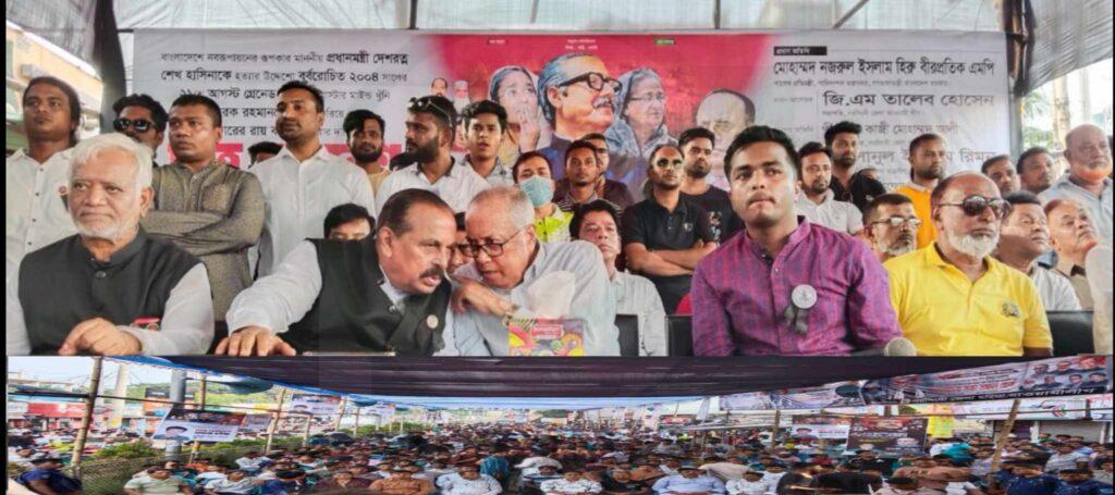 বঙ্গবন্ধুর কন্যা বাংলাদেশ আওয়ামী লীগের সভাপতি ও বর্তমান প্রধানমন্ত্রী শেখ হাসিনাকে হত্যার উদ্দেশ্যে ২০০৪ সালের ২১ আগস্ট রাজধানীর বঙ্গবন্ধু এভিনিউতে বর্বরোচিত গ্রেনেড হামলার মাস্টার মাইন্ড তারেক রহমানকে দেশে ফিরিয়ে এনে বিচারের রায় কার্যকর করার দাবীতে ছাত্র সমাবেশে করেছে নরসিংদী জেলা ছাত্রলীগ।