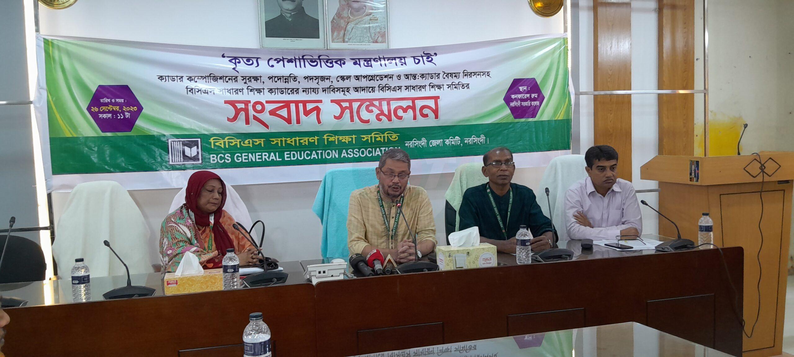 ক্যাডার কম্পোজিশন সুরক্ষা, পদোন্নতি, পদসৃজন, স্কেল আপগ্রেডেশন, আন্ত:ক্যাডার বৈষম্য নিরসন ও পেশাভিত্তিক মন্ত্রানালয় চালুসহ মোট ৬ টি দাবিতে সংবাদ সম্মেলন করেছে বিসিএস সাধারণ শিক্ষা ক্যাডারের শিক্ষকরা। মঙ্গলবার (২৬ সেপ্টেম্বর) দুপুরে নরসিংদী সরকারী কলেজের সম্মেলন কক্ষে দাবী আদায়ের লক্ষ্যে সংবাদ সম্মেলন করেন, বিসিএস সাধারণ শিক্ষা সমিতি নরসিংদী জেলা শাখা। বিসিএস সাধারণ শিক্ষা সমিতি নরসিংদী জেলা শাখার সভাপতি প্রফেসর সিরাজ উদ্দিন ভূইয়া'র সভাপতিত্বে সংবাদ সম্মেলন অনুষ্ঠিত হয়েছে।
