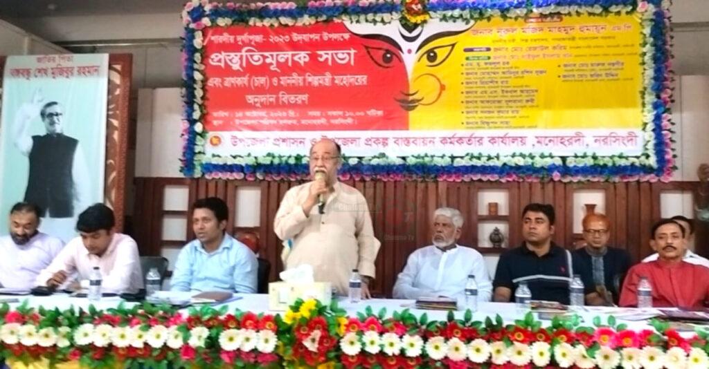 মনোহরদী সংবাদদাতাঃ হিন্দু ধর্মীয় সর্ববৃহৎ শারদীয় দূর্গোৎসব সুষ্ঠু ও সু শৃঙ্খল ভাবে উদযাপনের লক্ষে প্রস্তুতি সভা ও অনুদান বিতরণ অনুষ্ঠিত হয়েছে। শনিবার সকালে মনোহরদী উপজেলা প্রশাসনের উদ্যোগে উপজেলা অডিটরিয়ামে এই সভা ও বিতরণ অনুষ্ঠিত হয়। উপজেলা নির্বাহী অফিসার মোঃ রেজাউল করিমের সভাপতিত্বে প্রধান অতিথি ছিলেন, শিল্পমন্ত্রী এড. নুরুল মজিদ মাহমুদ হুমায়ুন এমপি।