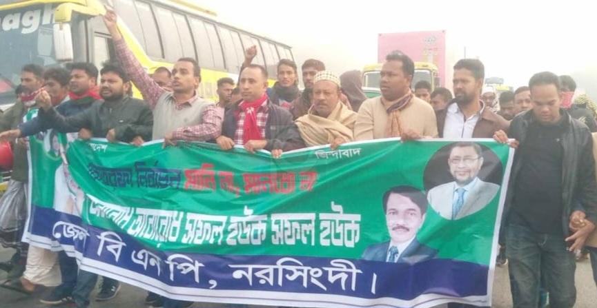 রবিবার (২৪ ডিসেম্বর) সকালে ঢাকা-সিলেট মহাসড়কের মরজাল চারাবাগ এলাকায় নরসিংদী জেলা বিএনপির ভারপ্রাপ্ত আহ্বায়ক এবং সাবেক সংসদ সদস্য বীর মুক্তিযোদ্ধা সরদার সাখাওয়াত হোসেন বকুল ও ভারপ্রাপ্ত সদস্য সচিব আবু ছালেহ চৌধুরীর তত্ত্বাবধানে বিক্ষোভ মিছিল করেন বিএনপির নেতা-কর্মীরা। এ সময় বিক্ষোভকারীরা ‘একতরফা নির্বাচন মানি না, মানব না’ বলে স্লোগান দিতে থাকেন।