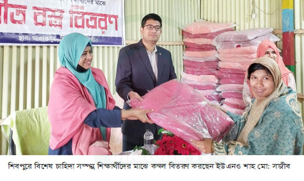 নরসিংদীর শিবপুর উপজেলার “শিবপুর প্রতিবন্ধী প্রাথমিক স্কুল” এর বিশেষ চাহিদা সম্পন্ন শিক্ষার্থীদের মাঝে শীত বস্ত্র হিসেবে কম্বল বিতরণ করেছেন অত্র প্রতিষ্ঠানের সভাপতি ও উপজেলা নির্বাহী অফিসার শাহ্ মোঃ সজীব। বৃহস্পতিবার উপজেলা প্রশাসনের পক্ষ থেকে উপজেলার আশ্রাফপুরে প্রতিষ্ঠিত অত্র প্রতিষ্ঠানে এই শীতবস্ত্র বিতরণ করা হয়।