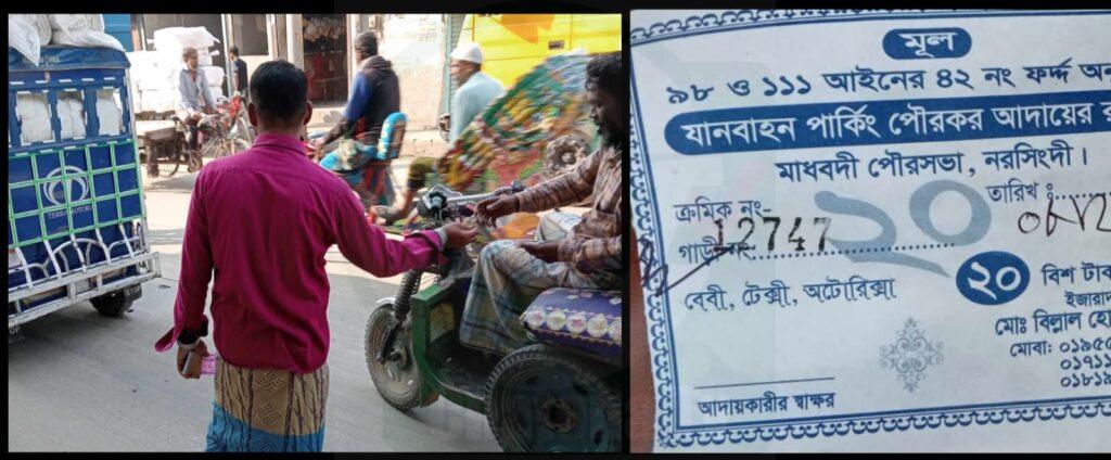 বৃহস্পতিবার (৮ ফেব্রুয়ারী) সকাল থেকে দুপুর পর্যন্ত সরেজমিনে গিয়ে দেখা যায়, মাধবদী পৌর এলাকা বাসস্ট্যান্ড, আনন্দীর মোড়, ম্যানচেস্টার চত্বর, নতুন ফায়ার সার্ভিসের মোড় ও স্কুল মার্কেট চত্বরে ঘুরে দেখা গেছে সিএনজি, অটোরিকশা, ভ্যান, ট্রলি থেকে পৌরসভার টোকেন দিয়ে এসব জায়গায় টোল বসিয়ে প্রশাসনের নাকের ডগায় বসে চোখের সামনে নিয়মিত চাঁদা আদায় করছেন। এসময় দেখা যায় বেশকয়েক জন লোক চাঁদা তোলায় ব্যস্ত।