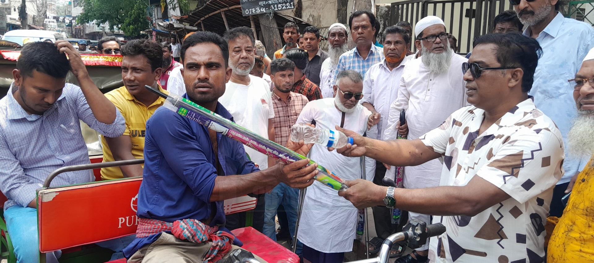 নরসিংদীতে রিকশা চালকদের মাঝে জেলা বিএনপির পানি ও ছাতা বিতরণ