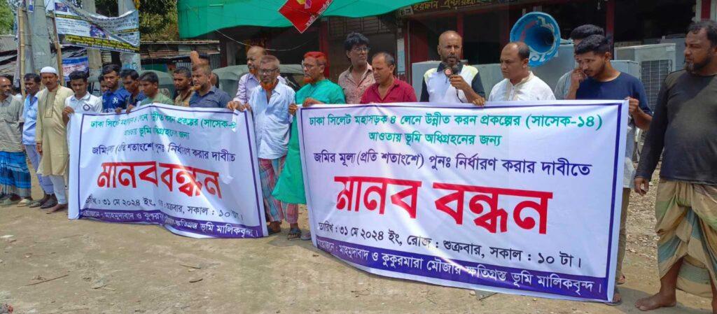 এ সময় ভুক্তভোগী ৮৬ জন জমির মালিক উপস্থিত ছিলেন। ওমর ফারুক, মজিবুর হাজারী, মুছলেহ উদ্দীন হাজারী, দেলোয়ার ভুইয়া, মোশারফ হোসেন ভূইয়া, হানিফ মিয়া বলেন, ঢাকা-সিলেট মহাসড়ক ৪ লেনে উন্নীত করণ প্রকল্প সড়ক নির্মাণের জন্য জমি অধিগ্রহণ করা হয়। কিন্তু ওই জমির বর্তমান দরের চেয়ে অনেক কম মূল্য নির্ধারণ করা হয়েছে। এতে জমির মালিকেরা আর্থিকভাবে ক্ষতিগ্রস্ত হচ্ছেন। বর্তমান দর বেশি হওয়ায় অধিগ্রহণের টাকা দিয়ে অন্যত্র জমি কেনা সম্ভব হচ্ছে না। ফলে জমি হারিয়ে অনেককে ভূমিহীন হতে হবে। জমির মূল্য পূণ:নির্ধারণ করাসহ অফিসে ঘুষ ছাড়া জমির ন্যায্য মূল্য চায় তাঁরা। এব্যাপারে একমাস আগে জেলা প্রশাসকের নিকট তাঁরা লিখিত অভিযোগের পরও কোনো সুরাহা না পেয়ে ক্ষোভ প্রকাশ করেন। এ বিষয়ে তাঁরা দ্রুত প্রধানমন্ত্রীর হস্তক্ষেপ কামনা করেন।