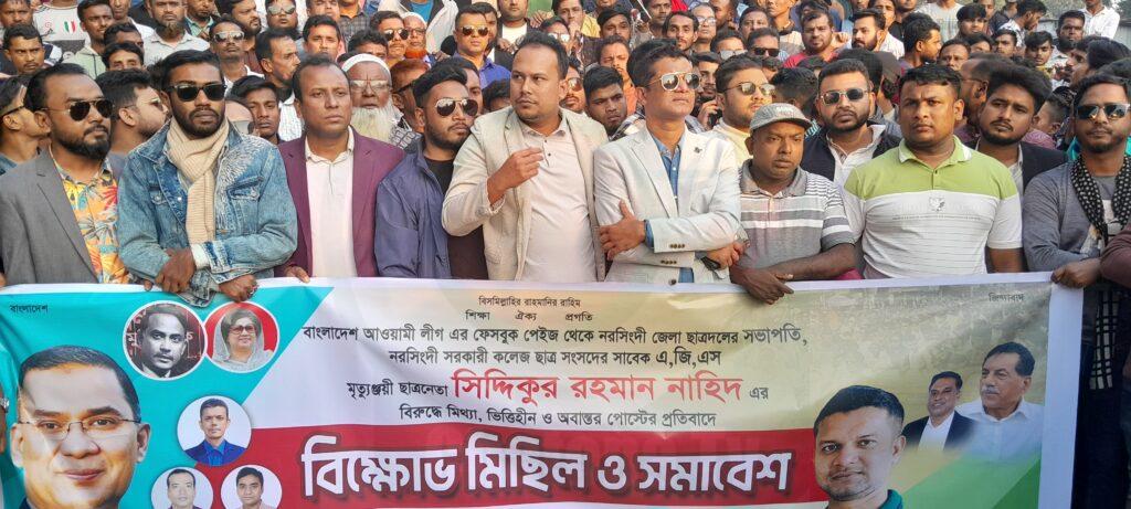 নরসিংদী জেলা ছাত্রদলের সভাপতি সিদ্দিকুর রহমান নাহিদ এর নামে আওয়ামিলীগের অফিসিয়াল ফেসবুক থেকে এডিট করা ছবি পোস্ট ও মিথ্যা তথ্যসহ অপপ্রচারের প্রতিবাদে বিক্ষোভ মিছিল ও সংক্ষিপ্ত সমাবেশ করেছে নরসিংদী জেলা ছাত্রদল।