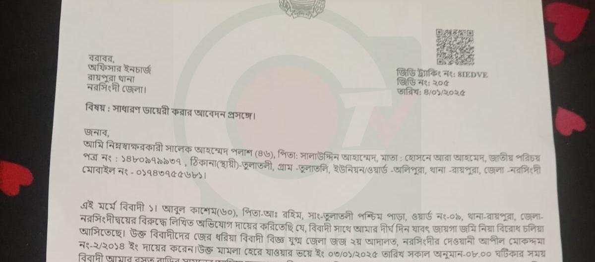 নরসিংদীর রায়পুরায় জমি সংক্রান্ত বিরোধী জের ধরে সাংবাদিককে প্রাণনাশের হুমকি প্রদানে অভিযোগ পাওয়া গেছে। শনিবার (৪ জানুয়ারি) রায়পুরা থানায় এ ব্যাপারে একটি সাধারণ ডায়েরি (জিডি) করেন সালেক আহমেদ পলাশ নামে এক সাংবাদিক । যার নং ২০৫, তারিখ ৪-১-২০২৫ ইং।