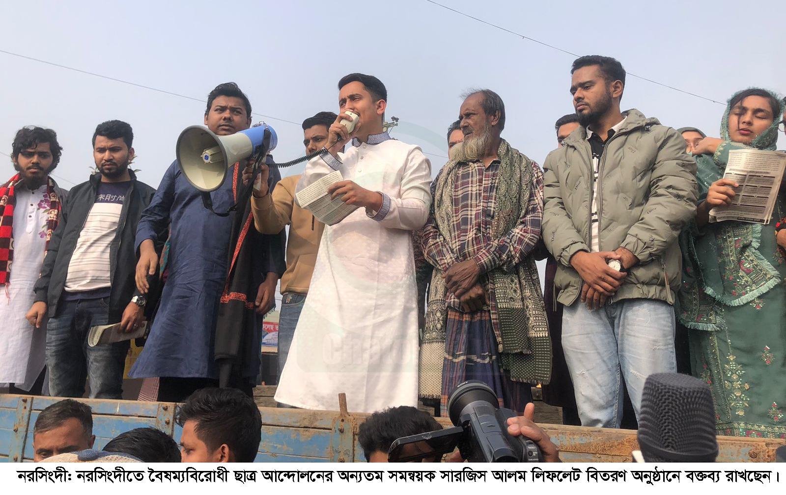 ইটাখোলা মোড়ে এক সংক্ষিপ্ত বক্তব্যে সারজিস আলম বলেন, জুলাই শহীদদের রাষ্ট্রিয় স্বীকৃতি, তাদের সরকারী খরচে চিকিৎসা, আওয়ামী খুনী ও দোষরদের বিচার এবং বৈষম্য বিরোধী ছাত্র আন্দোলনের নেতৃত্ব পরিস্কারভাবে উল্লেখসহ ৭ দফা যৌক্তিক দাবী নিয়ে জুলাই ঘোষণাপত্র ঘোষণার জন্য ১৫ দিনের সময়সীমা বেধে দেয়া হয়েছে। দ্রুত সময়ের মধ্যে রাষ্ট্র এই ঘোষণাপত্র বাস্তবায়ন করবে বলে প্রত্যাশা করেন তিনি। পরে তিনি নরসিংদীর সদরের জেলখানা মোড়, ডিসি রোডসহ বিভিন্ন স্থানে লিফলেট বিতরণ করেন। বৈষম্যবিরোধী ছাত্র আন্দোলন ও জাতীয় নাগরিক কমিটি কর্তৃক প্রকাশিত লিফলেট বিতরণ কর্মসূচিতে অন্যান্যদের মধ্যে উপস্থিত ছিলেন কেন্দ্রীয় সমন্বয়ক সারোয়ার তুষার, সামিয়া মাসুদ মম, শ্যামলী সুলতানা জেদনী ও দেলোয়ার আকন্দ সৌরভ।