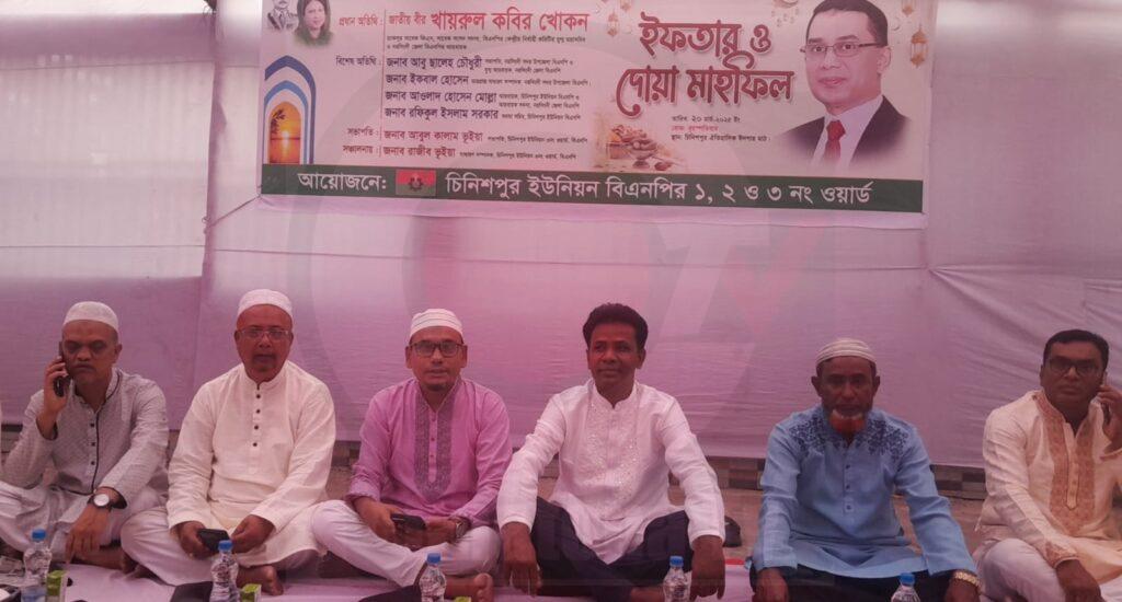 নরসিংদীতে চিনিশপুর ইউনিয়ন ১,২ ও ৩ নং ওয়ার্ড বিএনপির আয়োজনে পবিত্র মাহে রমজান উপলক্ষে ইফতার ও দোয়া মাহফিল অনুষ্ঠিত হয়েছে। বৃহস্পতিবার সন্ধ্যায় চিনিশপুর ঈদগাহ মাঠে অনুষ্ঠিত, ইফতার মাহফিলে প্রধান অতিথি হিসেবে উপস্থিত থাকার কথা ছিলো, বিএনপির যুগ্ম মহাসচিব ও নরসিংদী জেলা বিএনপির আহ্বায়ক খায়রুল কবির খোকন। কিন্তু খায়রুল কবির খোকনের বড় ভাই বিশিষ্ট সাংবাদিক রশিদুজ্জামান রুনু ইন্তেকাল করার কারনে তিনি উপস্থিত হতে পারেননি। চিনিশপুর ইউনিয়ন বিএনপির তিন নং ওয়ার্ড বিএনপির সভাপতি আবুল কালাম ভুইয়ার সভাপতিত্বে, ইফতার মাহফিলে বিশেষ অতিথি হিসেবে উপস্থিত ছিলেন,চিনিশপুর ইউনিয়ন বিএনপির সভাপতি ও জেলা বিএনপির আহ্বায়ক সদস্য আওলাদ হোসেন মোল্লা, জেলা মৎস্যজীবি দলের সভাপতি হাবিবুর রহমান মিলন,সাপ্তাহিক আজকের চেতনা পত্রিকার প্রকাশক ও সম্পাদক এবিএম আজরাফ টিপু, ব্রামন্দী গার্লস হাইস্কুলের প্রধান শিক্ষক আলতাফ হোসেন নাজির, ঘোড়াদিয়া হাইস্কুলের প্রধান শিক্ষক রফিকুল ইসলাম, জেলা ছাত্রদলের সাবেক সাধারণ সম্পাদক আব্দুর রউফ ফকির রনি, বিশিষ্ট আইনজীবী তানজিরুল হক,চিনিশপুর ইউনিয়ন বিএনপির সাধারণ সম্পাদক রফিকুল ইসলাম সরকার। তিন নং ওয়ার্ড বিএনপির সাধারণ সম্পাদক রাজীব ভুইয়ার সঞ্চালনায় ইফতারের পুর্বে খায়রুল কবির খোকনের বড় ভাই বিশিষ্ট সাংবাদিক রশিদুজ্জামান রুনু’র মাগফিরাত কামনা করে বিশেষ মোনাজাত করা হয়। এসময় চিনিশপুর ইউনিয়ন বিএনপি ও অঙ্গসংগঠনের নেতাকর্মীসহ এলাকার গন্যমান্য ব্যক্তিবর্গ উপস্থিত ছিলেন।