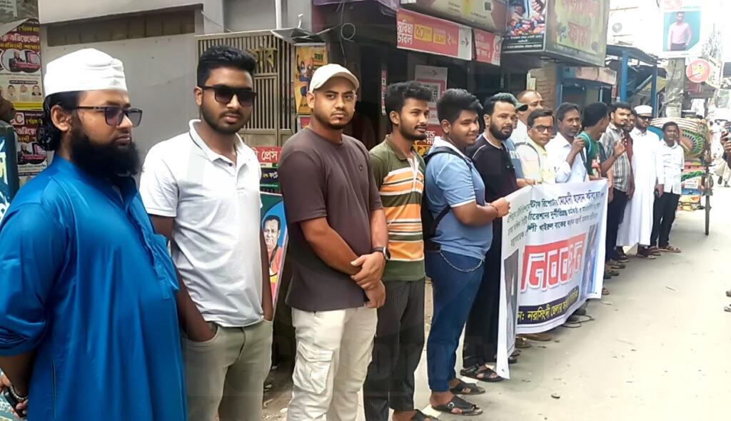 চেতনা রিপোর্ট: নরসিংদীতে এশিয়ান টেলিভিশনের স্টাফ রিপোর্টার মেহেদী হাসান কবিরের উপর বর্বরোচিত সন্ত্রাসী হামলার প্রতিবাদে নরসিংদী প্রেসক্লাবের সামনে এক মানববন্ধন কর্মসূচি অনুষ্ঠিত হয়েছে। এই কর্মসূচিতে অংশ নিয়ে হামলাকারীদের দৃষ্টান্তমূলক শাস্তির দাবি জানিয়েছেন জেলায় কর্মরত সাংবাদিকরা।