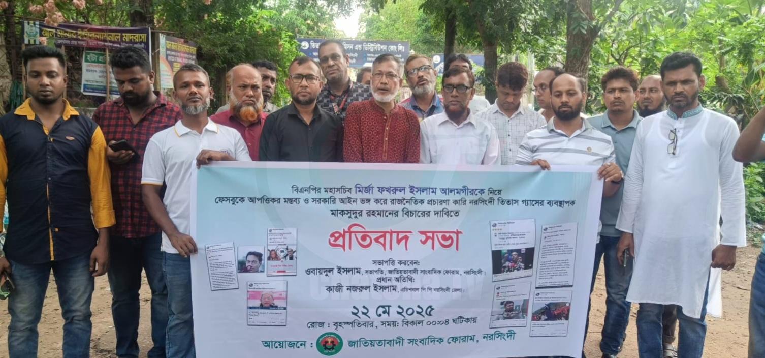 বিএনপি'র মহাসচিব মির্জা ফখরুল ইসলাম আলমগীরের বিরুদ্ধে আপত্তিকর মন্তব্য এবং সরকারি আইন লঙ্ঘন করে রাজনৈতিক প্রচারণা চালানোর অভিযোগে তিতাস গ্যাস ট্রান্সমিশন অ্যান্ড ডিস্ট্রিবিউশন কোম্পানির নরসিংদী অঞ্চলের ব্যবস্থাপক মাকসুদুর রহমানের বিচারের দাবিতে এক প্রতিবাদ সভা অনুষ্ঠিত হয়েছে।