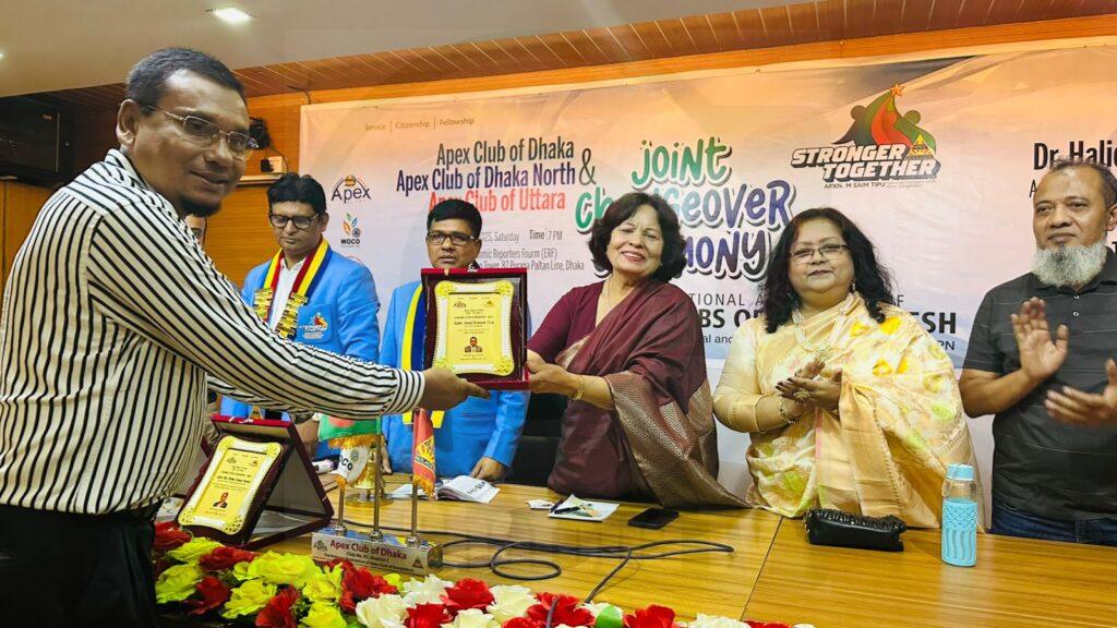 এপেক্স ক্লাব অব উত্তরা, এপেক্স ক্লাব অব ঢাকা ও এপেক্স ক্লাব অব ঢাকা নর্থের যৌথ পালাবদল অনুষ্ঠান গত ৩১ মে শনিবার ঢাকাস্থ ইআরএফ অডিটোরিয়ামে অনুষ্ঠিত হয়। এপেক্স ক্লাব ঢাকার প্রেসিডেন্ট এপে. মাকামে মাহমুদের সভাপতিত্বে অনুষ্ঠিত অনুষ্ঠানে প্রধান অতিথি হিসেবে উপস্থিত ছিলেন, বিশিষ্ট স্বাস্থ্য বিশেষজ্ঞ ও হেলথ ওয়াচের উপদেষ্টা ডা. হালিদা হানুম আখতার। বিশেষ অতিথি হিসেবে উপস্থিত ছিলেন এপেক্স ক্লাবস্ অব বাংলাদেশের জাতীয় সভাপতি এপে. এম সায়েম টিপু, ঢাকা রিপোর্টাস ইউনিটির সাধারণ সম্পাদক এপে. মইনুল হাসান সোহেল, জাতীয় সহ সভাপতি এপে. মাকসুদুর রহমান, সাবেক রাষ্ট্রদূত এপে. মাসুদ মান্নান, অতীত সভাপতি এপে. আব্দুল মতিন সিকদার, এনওয়াইসিডি এবিএম আজরাফ টিপু, ডিজি-১ তুষার কান্তি ঘোষ প্রমুখ।