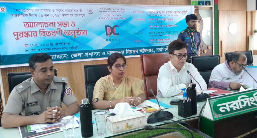 নরসিংদীতে মাদকদ্রব্যের অপব্যবহার ও অবৈধ পাচারবিরোধী আন্তর্জাতিক দিবস উদযাপন উপলক্ষে আলোচনা সভা ও পুরষ্কার বিতরণ অনুষ্ঠিত হয়েছে। জেলা প্রশাসন ও মাদকদ্রব্য নিয়ন্ত্রণ অধিদপ্তরের যৌথ আয়োজনে দিবসটি উপলক্ষে বর্ণাঢ্য র‍্যালী,আলোচনা সভা ও বিভিন্ন শিক্ষা প্রতিষ্ঠানে শিক্ষার্থীদের মাঝে রচনা ও চিত্রাঙ্কন প্রতিযোগিতার আয়োজন করেন।
