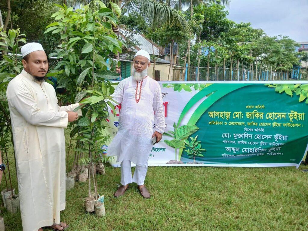 “লাগাবো গাছ গড়বো দেশ, সবুজ হবে বাংলাদেশ” এ স্লোগানে সামনে রেখে জাকির হোসেন ভূঁইয়া ফাউন্ডেশন এর উদ্যোগে বিভিন্ন শিক্ষা প্রতিষ্ঠান কবর স্থান ও ঈদগা মাঠ সহ ১৫টি প্রতিষ্ঠানে বৃক্ষরোপণ কর্মসূচি মাধ্যমে গাছের চারা বিতরণ করা হয়। গত ৩ জুলাই বৃহস্পতিবার সকালে ভগিরথপুর মাদ্রাসা সংলগ্ন মাঠে ফলদ কাঠ গাছের চারা বিতরণ উদ্বোধন করেন জাকির হোসেন ভূঁইয়া ফাউন্ডেশনের প্রতিষ্ঠাতা ও চেয়ারম্যান আলহাজ্ব মোঃ জাকির হোসেন ভূঁইয়া। গাছের চারার মধ্যে ছিল আম, জাম, নিম, আকাশী, কাঠাল ও মেহগনি। জাকির হোসেন ভূঁইয়া তার বক্তব্যে বলেন, পরিবেশের ভারসাম্য রক্ষার্থে জাকির হোসেন ভূঁইয়া ফাউন্ডেশনের পক্ষ থেকে বৃক্ষরোপন কর্মসূচির কার্যক্রম চলমান থাকবে।