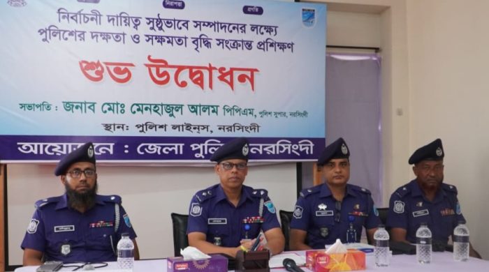 নির্বাচনী দায়িত্ব সুষ্ঠুভাবে সম্পাদনের লক্ষ্যে পুলিশের দক্ষতা ও সক্ষমতা বৃদ্ধি সংক্রান্ত প্রশিক্ষণ কোর্সের ৫ম ব্যাচের উদ্বোধন উদ্বোধন অনুষ্ঠানে এসব কথা বলেন পুলিশ সুপার। মঙ্গলবার (২১ অক্টোবর) নরসিংদী পুলিশ লাইন্সের নতুন ভবনের হলরুমে প্রশিক্ষণ কোর্স শুরু হয়েছে। প্রশিক্ষণ কোর্সে জেলা পুলিশের বিভিন্ন পদমর্যাদার ৫০ জন পুলিশ সদস্য অংশগ্রহণ করছেন।